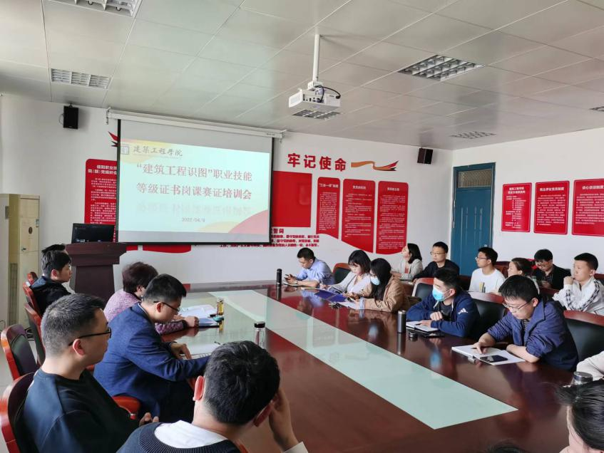 4月8日下午,pa集团官网入口院长刘玉清、副院长黄波、教务办主任潘磊、实验实训办主任邱岗等领导在学院三楼会议室组织建筑技术和工程造价教研室全体教师参加广州中望龙腾软件股份有限公司组织的建筑工程识图证书“岗课赛证”融通培训会。