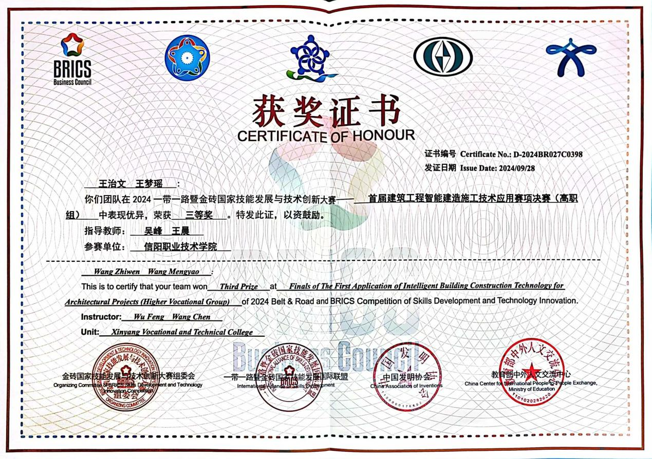 9月26日至28日,在2024年度“一带一路”暨金砖国家技能发展与技术创新大赛首届建筑工程智能建造施工技术应用赛项决赛中,我校pa集团官网入口23级智能建造技术专业学生王治文,王梦瑶经过激烈竞争,凭借扎实的专业技能和出色的表现,成功取得了全国三等奖的优异成绩