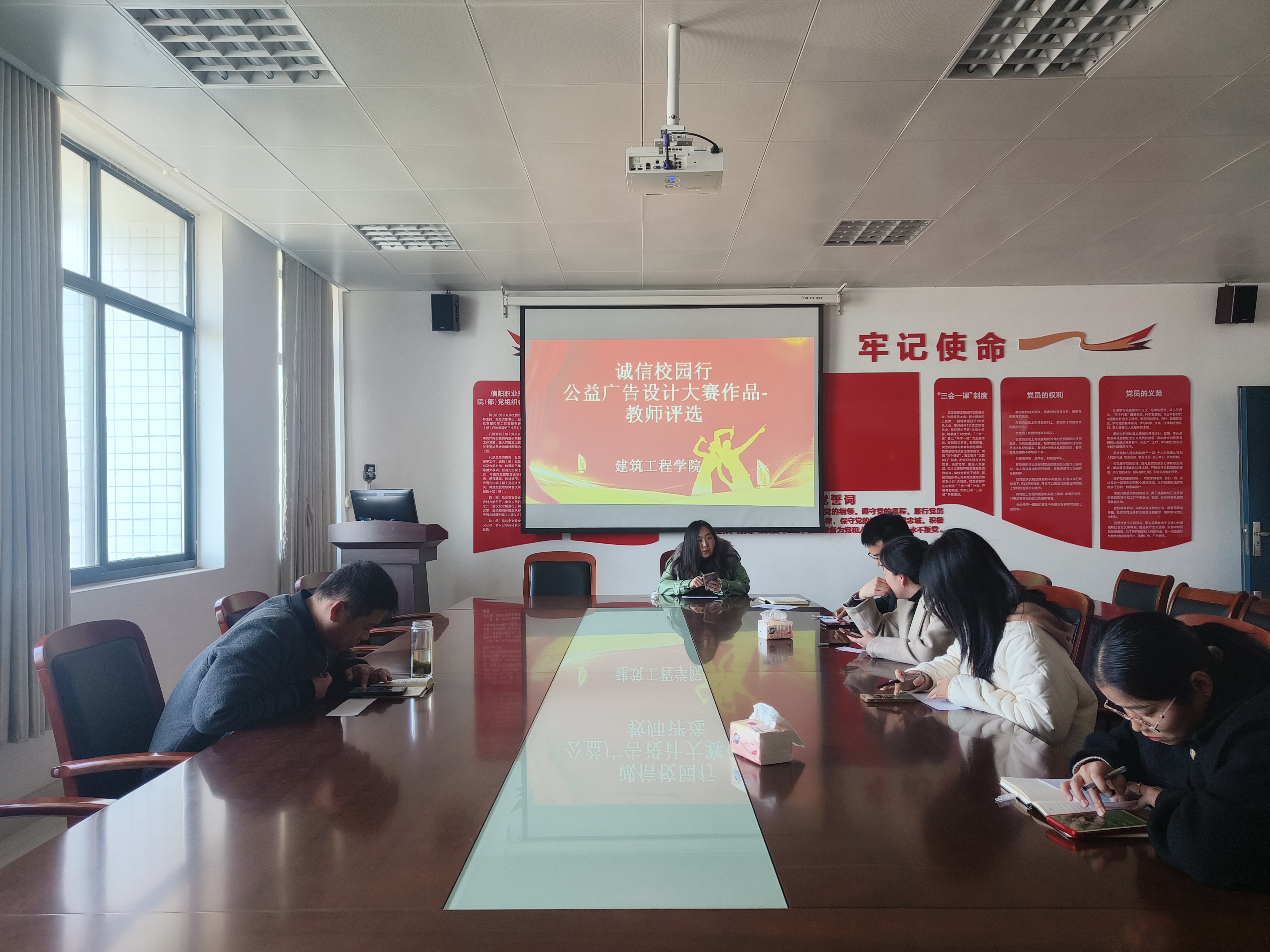 建工学院采取线上线下相结合的方式,对学生作品开展评选活动。3月8—11日,建工学院在“出彩建工”微信公众号上发布参赛作品投票链接,组织全院学生积极参与,为心仪的作品投上宝贵一票。3月11日,由副院长董晶、专职辅导员和专业教师组成的评审团,在3013会议室观看了学生作品的匿名展示,评审老师,从画面布局、色彩搭配等专业角度出发,结合创作理念和作品涵义,对学生作品进行了线下打分。最终,根据线上和线下评选的总成绩,选出优秀作品推送至学校,参加校级比赛。