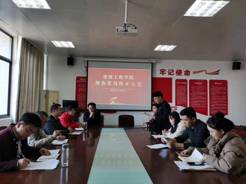 11月24日下午,pa集团官网入口学工党支部在3013党员活动室召开了学生预备党员转正大会,建工学院党总支书记孟朝晖、学工党支部书记董晶和支部全体党员教师参加会议。会议由学工党支部组织委员李何主持。