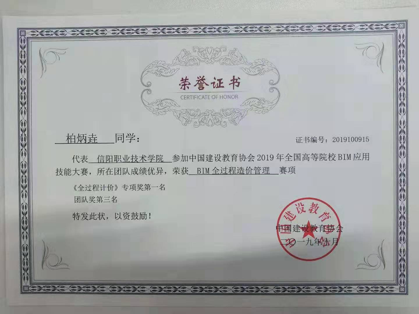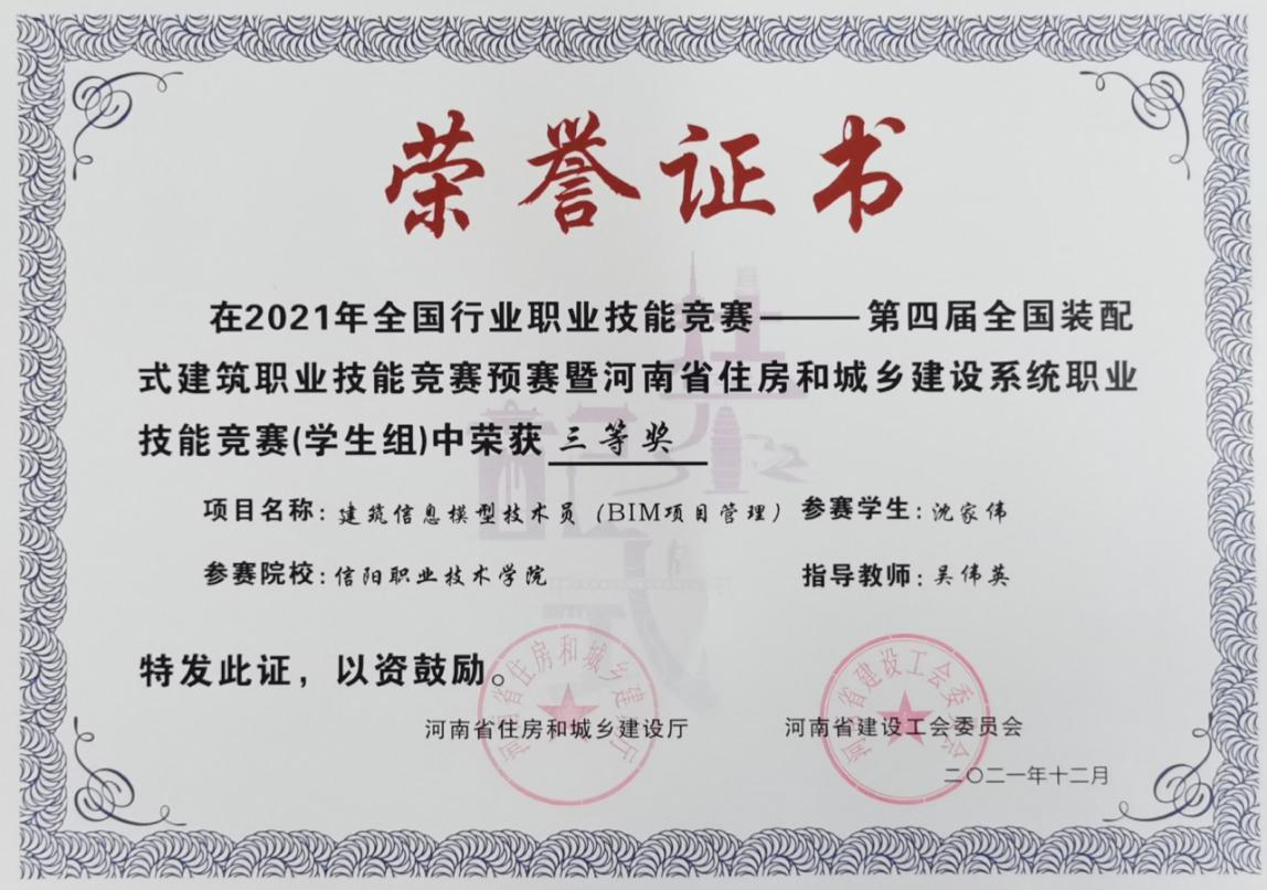【获得荣誉】2016年河南省建设类院校第一届工程造价技能大赛二等奖;2017第二届河南省工程造价技能大赛三等奖;2018年信阳市中等职业教育技能大赛学生二等奖;2019年河南省第四届工程造价技能大赛BIM5D施工项目成本管理专项一等奖、团队三等奖;2019年全国高等院校BIM应用技能大赛全过程计价专项一等奖、团队三等奖;2021年河南省第六届工程造价技能大赛BIM施工管理专项一等奖、团队三等奖;2021年全国数字建筑创新应用大赛数字建筑工程管理综合赛项团队三等奖。