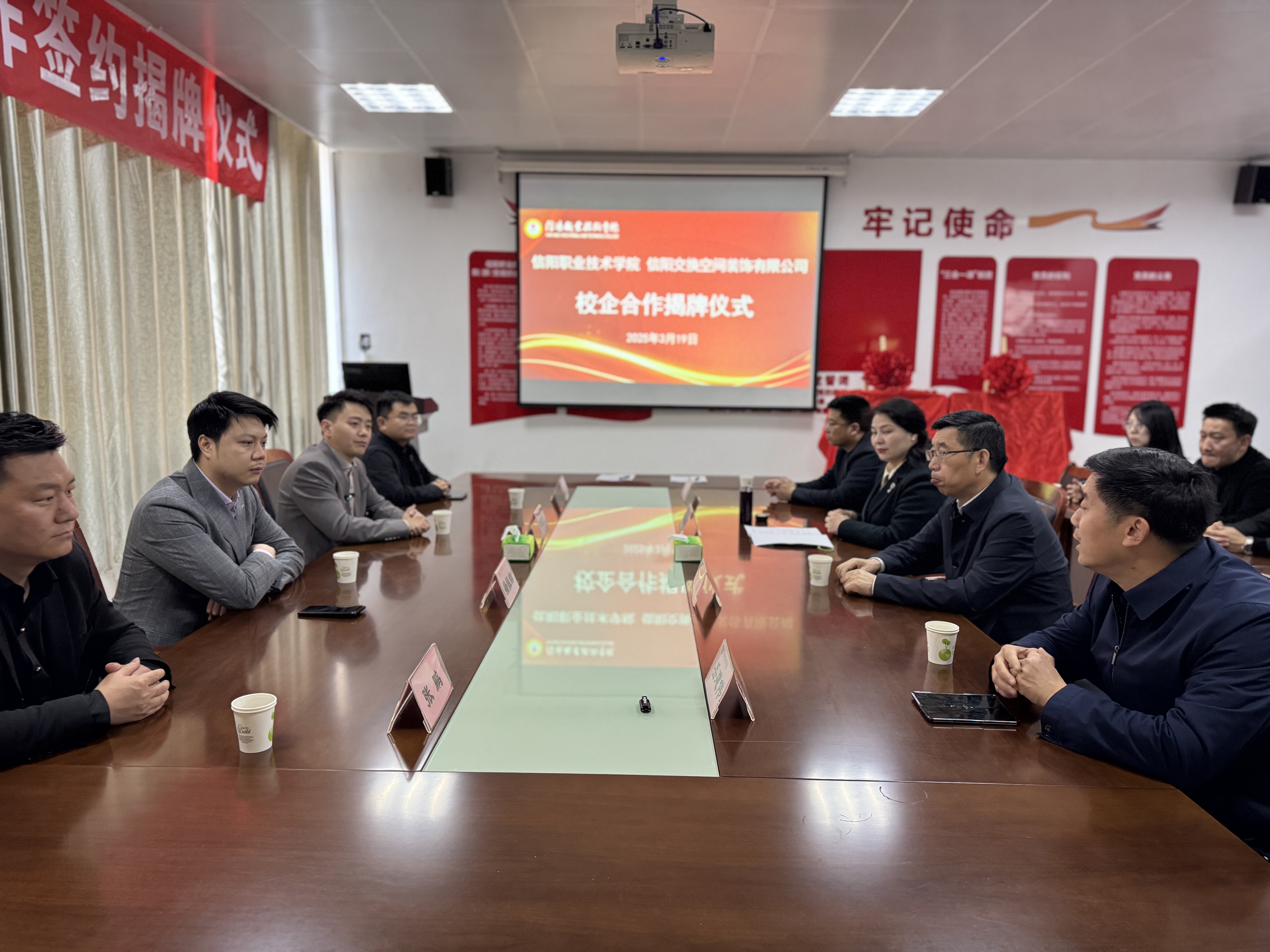 为深化产教融合校企合作,不断提升人才培养质量,服务地方高质量发展,3月19日,我校在前期与信阳交换空间装饰有限公司签约的基础上,举行校企合作揭牌仪式。交换空间董事长李鹏飞、副总裁杨程钧、总经理刘根、工程部总监张鹏,学校教务处处长余磊,pa集团官网入口党总支书记刘亚梅、院长岳建伟出席。