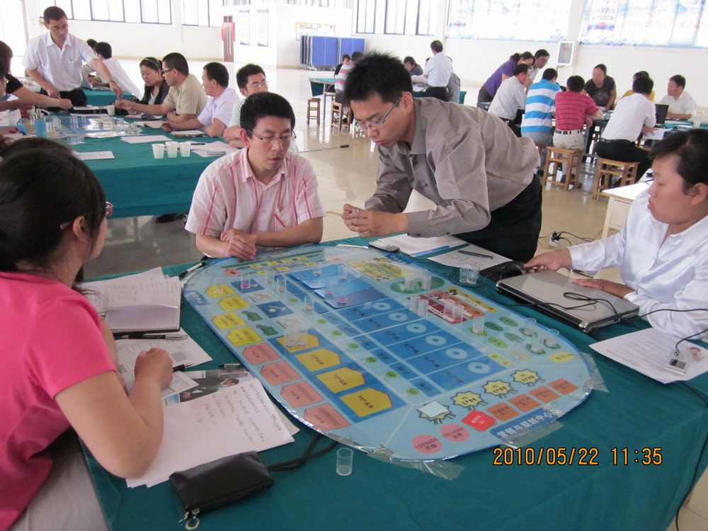 本次培训共48名教师,随机组成6组组建虚拟公司,进行经营对抗。各小组自行组建CEO、CFO、 CMO、COO、CPO等企业运营团队,经过4个年度的模拟经营,6个组(公司)经营业绩各有不同:有的企业在运营团队的领导下,业绩良好;有的企业由于经营不善资不抵债而倒闭提前出局;还有的公司在不断地亏损中。但其中的三家公司在全体成员的努力下逐渐扭亏为盈。