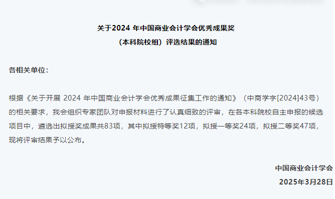 近日,在中国商业会计学会举办的2024年本科院校会计教学类教学成果奖项评选中,开云kaiyun官方网站王桂荣教学团队在学院的大力支持下,凭借多年积累的课程教学改革与实践经验,荣获优秀教学成果奖二等奖。