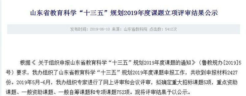 近日,山东省教育科学“十三五”规划2019年度课题立项评审结果公示,开云官网在此次立项中喜获佳绩。本次立项工作开云官网组织报送申报课题7项,获批3项,省财政经费资助的项目 1 项,一般自筹项目2项。
