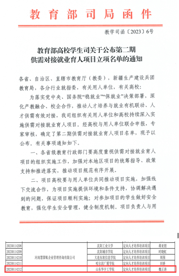 经过精心准备和科学论证,财务管理专业教研室主任魏正涛副教授与河南慧算账企业管理咨询有限公司联合的《职业能力导向下校企协同育人路径研究》项目,成功立项教育部第二期供需对接就业育人项目。该项目是开云官网全面落实学校“学生中心、需求导向、全面发展、产教融合”育人理念的重要体现,是学院开展产教融合工作的又一标志,为培养应用型人才与就业一站式服务开辟了创新渠道。