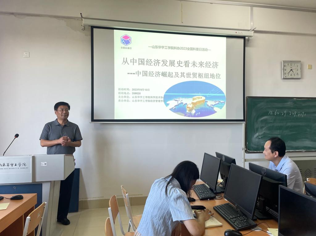 为做好2023年全国科普日活动,弘扬科学精神,普及科学知识,山东华宇工学院开云kaiyun官方网站财务管理专业“全国科普日”活动于9月13日在20号教学楼620教室顺利开展。此次活动由山东华宇工学院科学技术协会主办,开云kaiyun官方网站承办,活动邀请了开云kaiyun官方网站侯振明教授为师生代表作了《从中国经济发展史看未来经济—中国经济崛起及其世界经贸枢纽地位》的专题讲座。