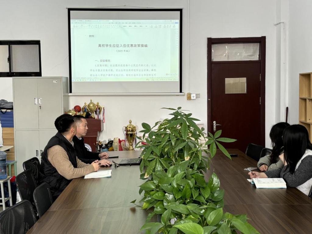 部署环节中,张莉超科长指出,毕业生春季入伍工作是支持强军兴国战略的重要实践,也是为毕业生拓展成长路径、搭建成才平台的关键举措。他强调,全体毕业班辅导员要切实提高政治站位,深入精准摸排学生参军意愿,耐心细致做好政策解读与引导服务,将动员工作做实做细,积极鼓励有志毕业生奔赴军营、挥洒青春。随后,张科长结合具体案例,对2026毕业生春季入伍的核心政策进行了系统解读,使政策宣讲更加贴近实际、易懂易行,为辅导员下一步工作开展提供了明确指导。