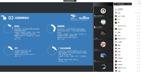 三家企业的招聘负责人分别从公司的发展历程、规章制度、薪资待遇及应聘者的具体要求和发展通道进行了讲解,并结合内部员工的工作经历与同学们分享了经验与心得。通过腾讯会议线上会议的的方式,招聘负责人与应届毕业生进行交流与沟通,同时对于同学们提出的疑问,招聘负责人进行了相应的讲解。