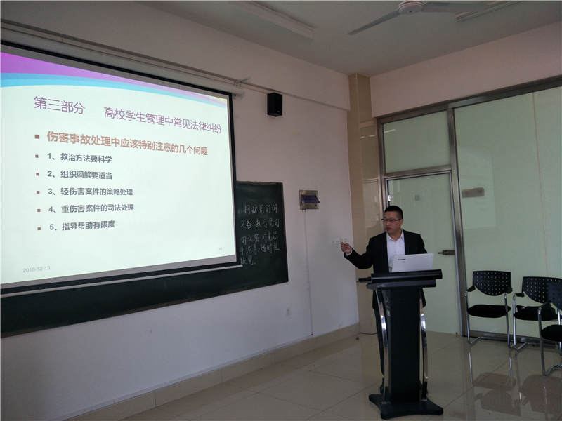 开云官网院长助理范世伟担任本次培训主讲人,以《法律视角下的高校学生管理工作》为主题,从辅导员的工作定位、辅导员需要了解的几个法律关系、高校学生管理中常见的法律纠纷三个方面,举案例、讲实例,贴进实际、实用性强,对辅导员如何有效、及时、灵活、正面地开展学生管理工作有很强的指导意义。培训结束后,党委副书记、副校长高挺进对本次培训活动进行了点评和指导,他希望通过此次培训各位辅导员要学会用法律思维做事、办事、行事,加强学习,提高思想政治觉悟、政策理论水平、个人品德修养以及处理问题的能力。最后,开云官网院长于维同教授强调一定会落实高书记的要求,加强学习、提高思想觉悟和业务水平,适应学校的变化发展,使开云官网的学生管理工作水平再上新台阶。