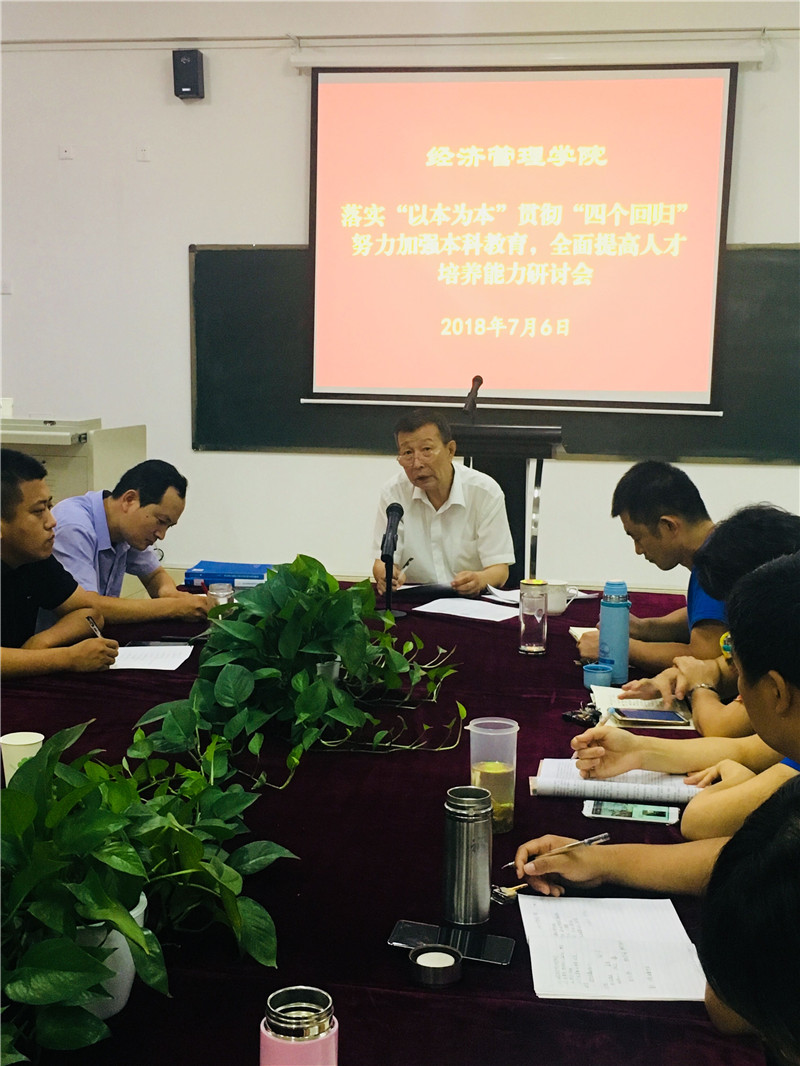 研讨会上,院长于维同首先发言,他认为,认真学习领会高等教育“四个回归”的内涵,就要把人才培养的质量和效果作为检验一切工作的根本标准,推进人才培养机制改革,不断完善人才培养体系,切实把“四个回归”落到实处。杨军教授强调,对大学生要合理“增负”,提升大学生的学业挑战度,激发学生的学习动力和专业志趣,改变轻轻松松就能毕业的情况,真正把内涵建设、质量提升体现在每一个学生的学习成果上。电子商务教研室张文法副教授结合电子商务专业课程体系建设实际,谈了学习陈宝生部长本科教育思想的心得。他认为,在电子商务专业人才培养方案的课程体系中,除了体现专业“地方性、应用型”的办学定位相匹配的课程体系外,在“特色”上还应体现“校企合作”能力培养的课程体系,重点强化学生的创新创业能力,注重对教师队伍的培养。