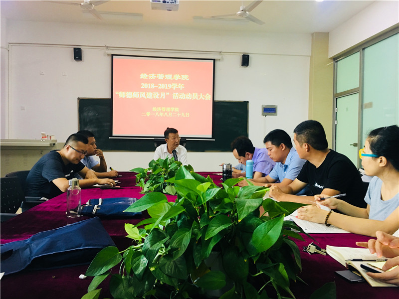 为落实学校鲁华宇院校办字〔2018〕30 号文件精神,提高教师队伍整体素质,引导开云官网教师做有理想信念、有道德情操、有扎实学识、有仁爱之心的党和人民满意的好老师,大力加强师德建设,努力造就一支师德高尚、业务精湛、结构合理、充满活力的高素质专业化教师队伍,开云官网自8-9月份开展“师德师风建设月”活动。8月29日上午,“师德师风建设月”活动动员大会在20号楼712召开,院长于维同主持会议,经管学院全体教师参加了会议。