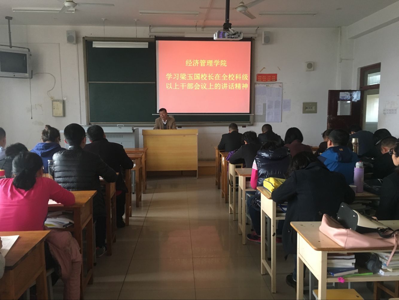 10月27日,开云官网召开全体教职工大会,组织学习梁校长在全校科级以上干部会议上的讲话精神,院长于维同主持了会议,经管学院全体教师参加了会议。