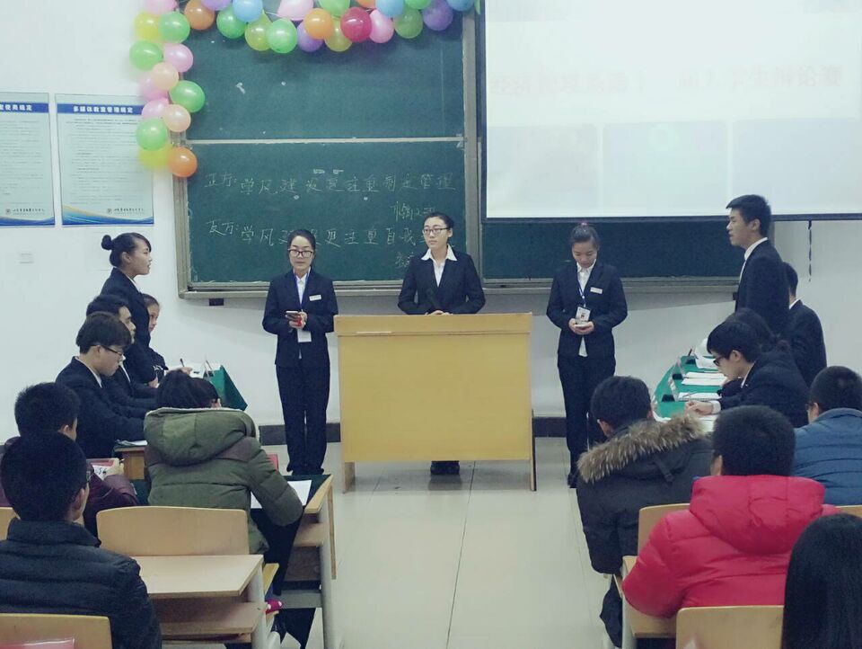 为进一步贯彻落实学院《关于加强教风学风建设的工作意见》和《经济管理系教风学风建设的实施方案》,丰富经管系学生课余生活,活跃校园文化,培养学生团结、竞争、进取的精神,展现经管系学子风采,促进经管系学风建设。我系举办了“经济管理系第十届辩论赛”,经过9场预选赛,6场复赛的比拼,12月28日晚7点,在10#F401迎来了经管系第十一届辩论赛总决赛,总决赛由正方15级高职市场营销二班对阵反方15级高职物流一班,正方观点是学风建设更注重制度管理,反方观点是学风建设更注重自我约束。经管系系主任李虎君,主任助理范世伟以及三位学管老师担任本次辩论赛总决赛的评委。