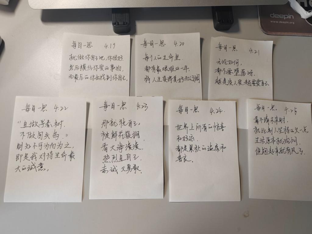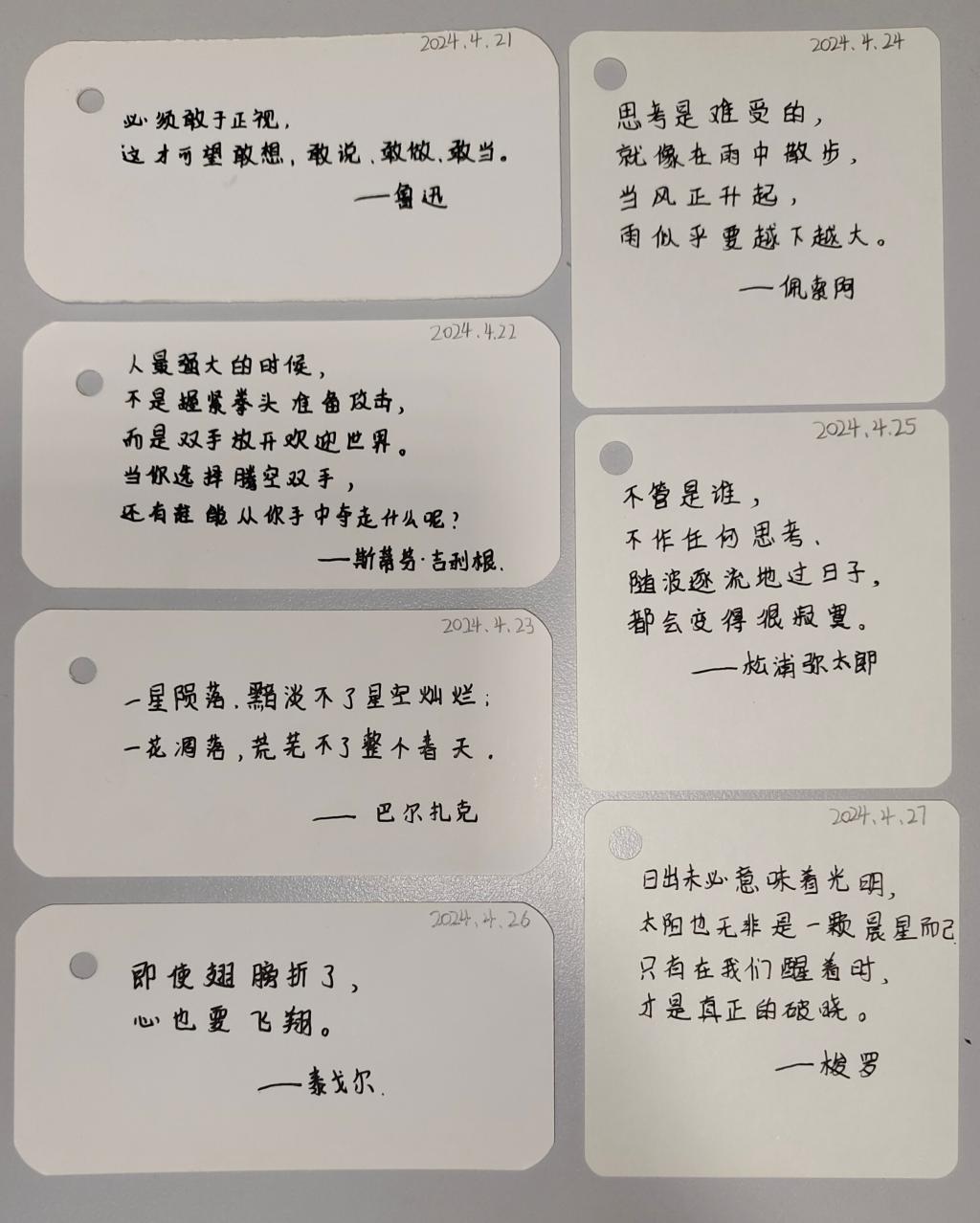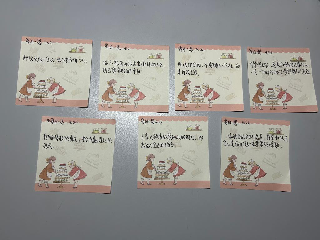 本次活动在第二课堂上发布,由班级养成教育自治小组组长 主题宣讲的形式,在班级中进行了宣传,对活动的宗旨、内容、意义等进行了介绍,参与的同学以填写文创卡片的方式参与“每日一思之记录一周”活动。
